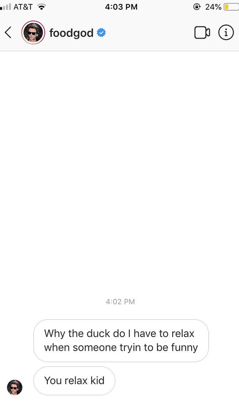 “Listen to me you little lowlife. If you think he opens his own gmail account messages from pathetic non existent non relevant in life humans than you must be as dumb..well as you are. We here at the social media team laugh at cowards like you who hide you are our entertainment. Your message would not come a hundred years next to foodgod who is working on multi million dollar deals while u sit home broke jerking off. Have a great ?? life.”