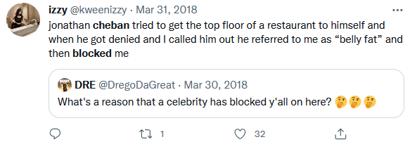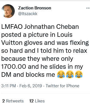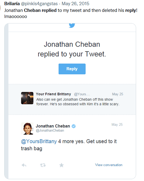 Anyway like I said earlier there really are countless instances of him being a dick. I know I promised y’all I counted them all but even you would be bored if I listed out every single mean tweet he’s done. If you want to see the majority of them though, please check this twitter search for hours upon hours of entertainment: https://twitter.com/search?f=tweets&q=cheban%20blocked&src=typd