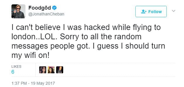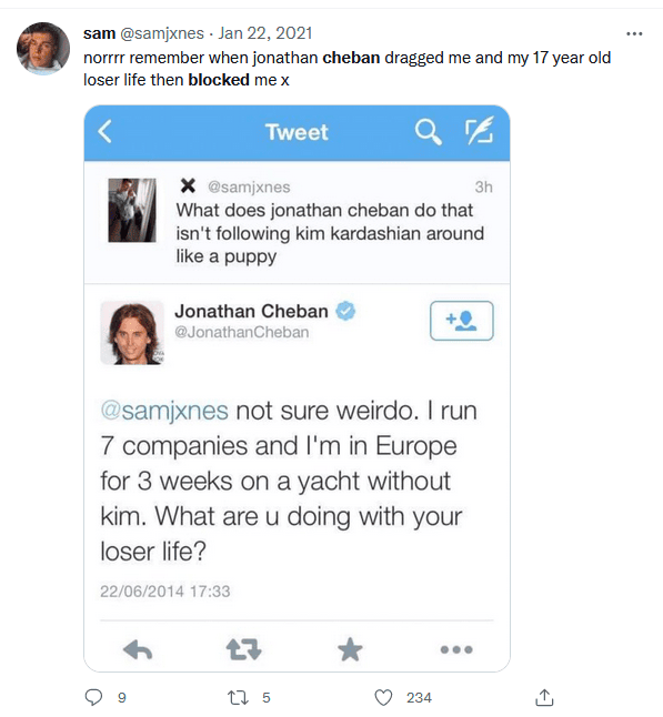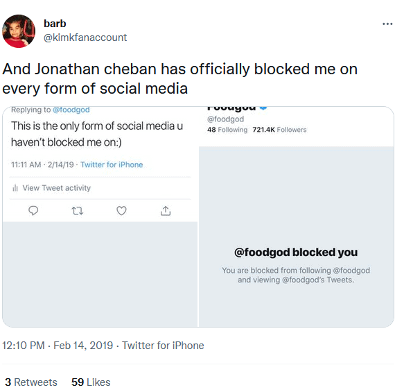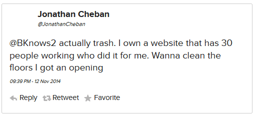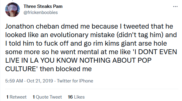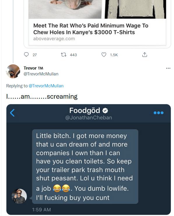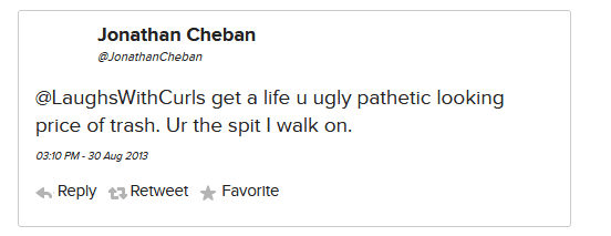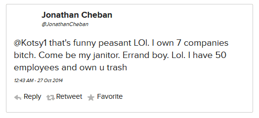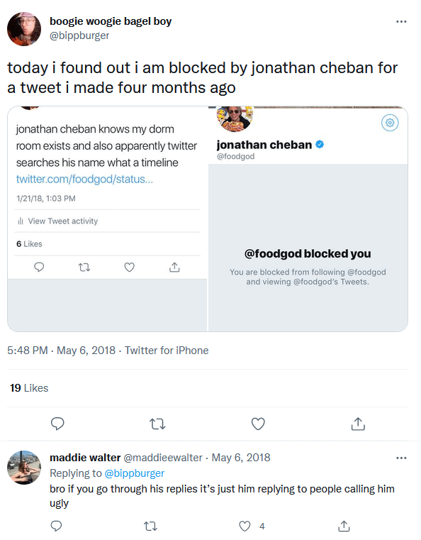 And ummm, from like 2011–2018 (but honestly. he probably still does this to this day) he is REGULARLY, constantly monitoring his direct mentions and searching his own name on twitter and just popping off at strangers who mildly insult him. All the original tweets are now gone because he got rid of his @ JonathanCheban twitter handle in exchange for his foodgod one .. but this article from 2016 still has it all documented.
