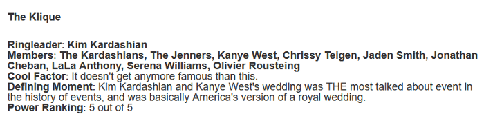 Another solid article he wrote on September 18 2014 is all about hollywood cliques and he goes ahead and ranks them on a “power ranking” scale of 1–5 for our viewing pleasure. Of course he includes himself in Kim’s clique….orrrr I guess Klique as Jonathan calls it: